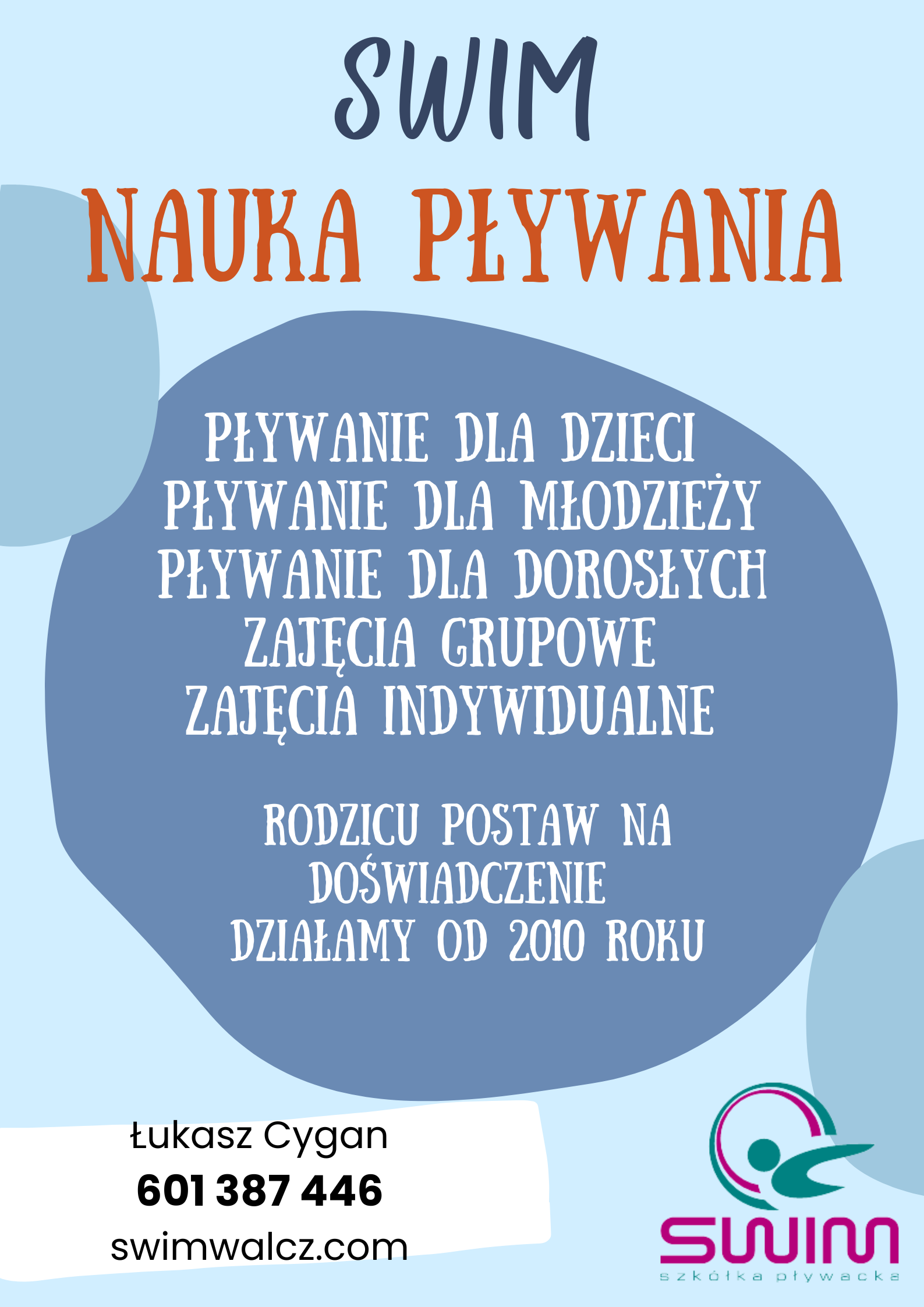 Nasza szkoła pływania oferuje zajęcia dla dzieci, młodzieży i dorosłych na każdym poziomie zaawansowania. Nauczymy Cię bezpiecznie pływać, a także poprawimy Twoją technikę i kondycję.
